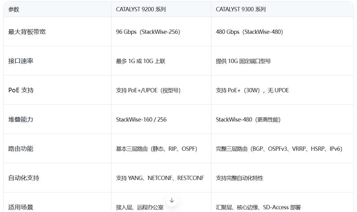 Cisco Catalyst 9200 系列 和 Catalyst 9300 系列 交换机的详细对比分析,涵盖主流型号、接口数量与速率、背板带宽、PoE 支持、堆叠能力、软件版本等关键参数。这两个系列是目前企业园区网络中应用的 L2/L3 可管理交换机 ,适合接入层和轻量级汇聚层部署。