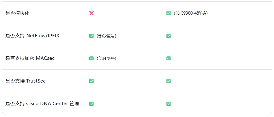 是否支持模块化插槽 | ❌ | ✅(如 C9300-48Y-A) |